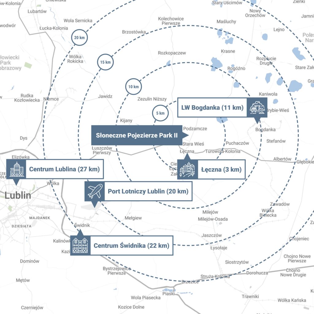Słoneczne Pojezierze Park II to idealne miejsce dla tych, którzy szukają balansu między spokojem a wygodą. W okolicy Podzamcza i w Łęcznej masz wszystko, czego potrzebujesz – sklepy, szkoły, usługi oraz szybki dostęp do większych miast, takich jak Lublin. Dzięki bliskości głównych dróg dojazdowych i lotniska w Świdniku, podróże służbowe czy weekendowe wypady staną się łatwiejsze niż kiedykolwiek.