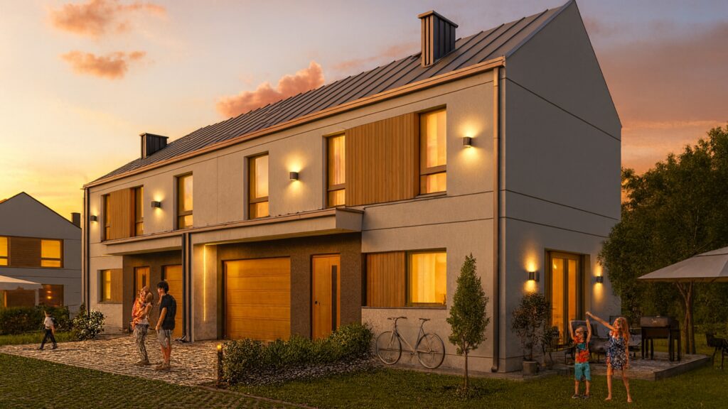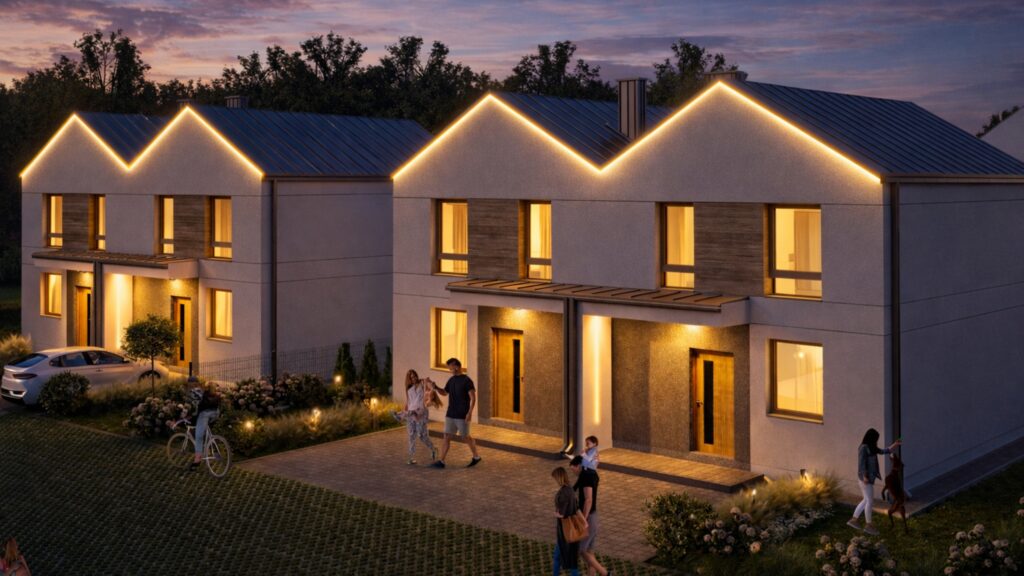 | Po zmroku osiedle zyskuje wyjątkowy charakter dzięki subtelnemu ambientowemu oświetleniu elewacji i stref wejściowych. Światło podkreśla architekturę budynków, poprawia bezpieczeństwo i tworzy spokojną, elegancką atmosferę całej inwestycji.